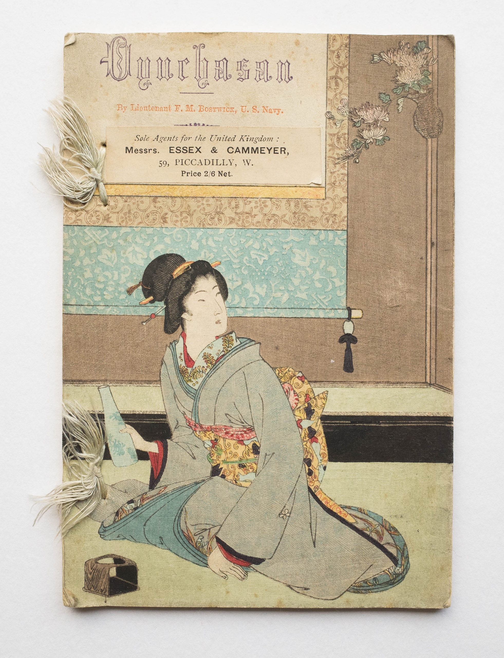 Title: “Oyuchasan”. ‘Composed by Lieutenant F.M. Bostwick, US Navy, and sang to the air of “Rosalie”‘. Author: F.M. Bostwick. Publisher: Kobunsha (= Takejirō Hasegawa 長谷川 武 次郎 (1853-1938), Tokyo. Year of publication: 1890 (Meiji 23). The first and only edition of this book on plain paper. Crepe paper editions with different illustrations followed in 1892 and 1893. Size: 18.5 x 12.6 cm. Including the cover, 11 folded pages. With two unique labels for the distributor/banjo manufacturer Essex & Cammeyer for the UK market and an advertisement for a banjo accompaniment to the song arranged by Mr. Clifford Essex.